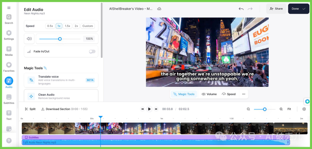因此,为了让音乐更加栩栩如生,我们将 Suno 写的歌,导入到 VEED.IO 里进行 MV 创作。