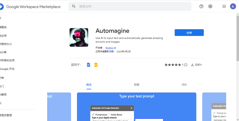 Automagine 是 Google Workspace Marketplace 上提供的一款人工智能工具,允许用户输入文本并自动生成令人惊叹的艺术作品和图像。 通过利用新的稳定扩散人工智能模型的强大功能,用户可以描述他们想要的艺术品或图像,只需单击按钮,该工具就会生成所需的图像。