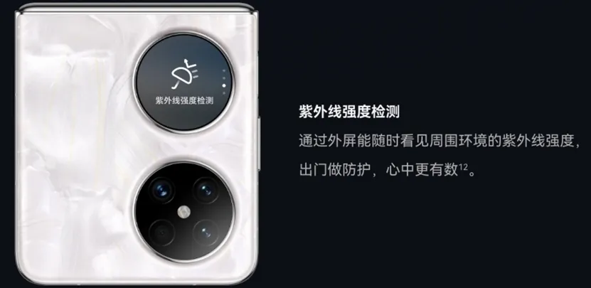 考虑到女性用户在小折叠屏购买人群中占有较大比重,华为还对这块可以常亮的外显屏做了针对性的功能优化。比如可以通过影像模组上的传感器和镜头,判断当前环境的紫外线指数,并显示在外屏上。