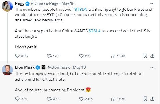 一位特斯拉投资者发帖称:“很多人希望特斯拉(一家美国公司)破产,而宁愿看到比亚迪(一家中国公司)蓬勃发展并获胜,这是令人担忧的、荒谬的和倒退的。疯狂的是,中国希望特斯拉成功,而美国却在攻击它。我不明白。”