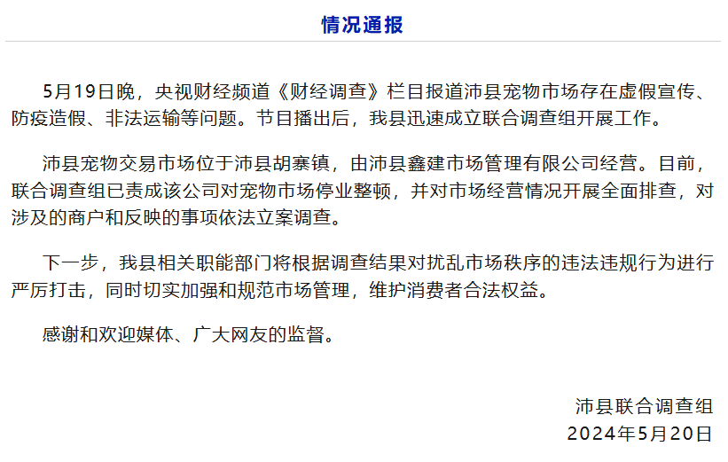 “沛县发布”官方微信发布情况通报:5月19日晚,央视财经频道《财经调查》栏目报道沛县宠物市场存在虚假宣传、防疫造假、非法运输等问题。节目播出后,我县迅速成立联合调查组开展工作。沛县宠物交易市场位于沛县胡寨镇,由沛县鑫建市场管理有限公司经营。目前,联合调查组已责成该公司对宠物市场停业整顿,并对市场经营情况开展全面排查,对涉及的商户和反映的事项依法立案调查。