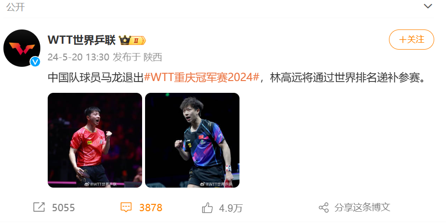 据WTT世界乒联,中国队球员马龙退出WTT重庆冠军赛2024,林高远将通过世界排名递补参赛。