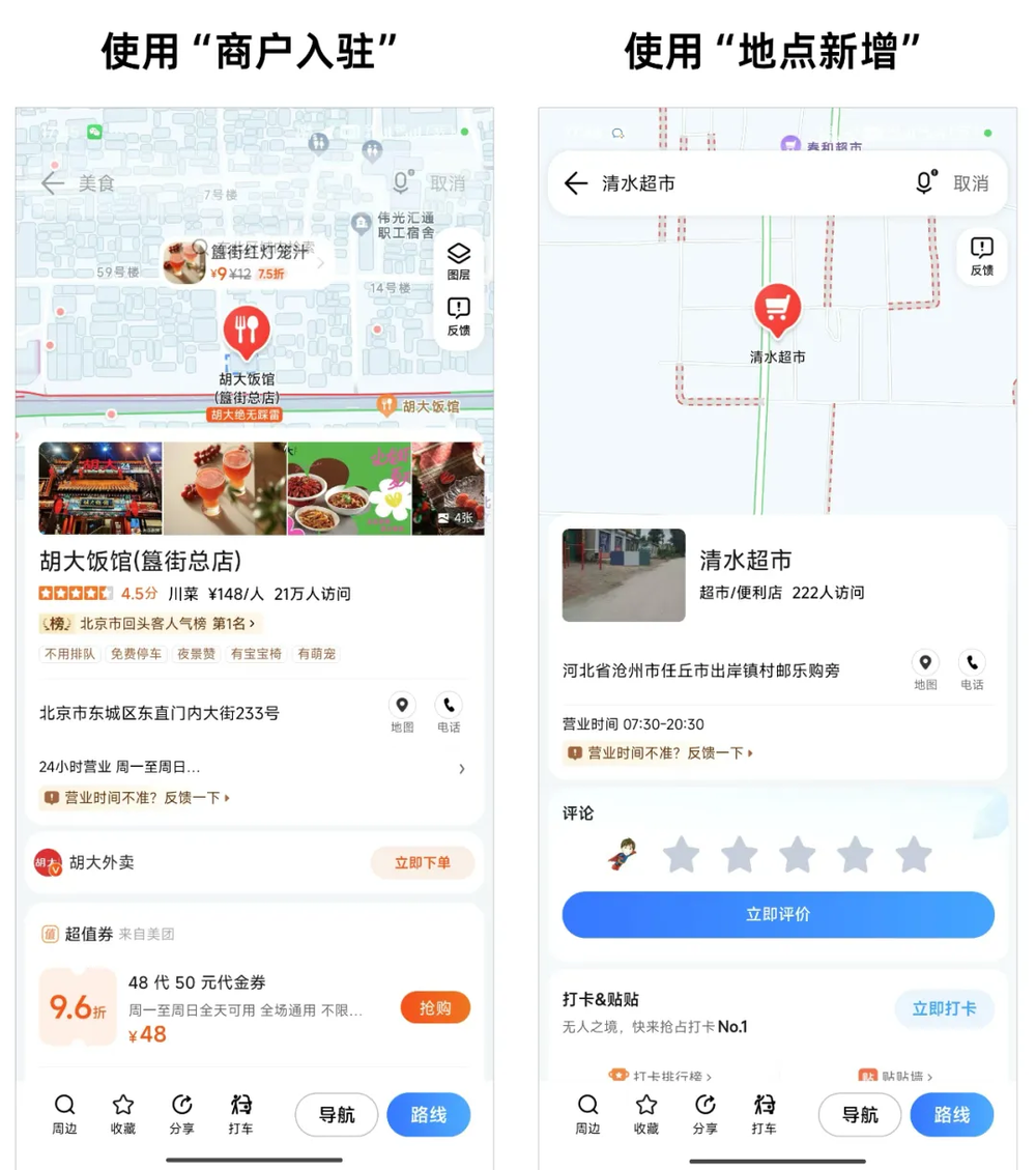 可以根据店铺的形态进行选择,如果是餐厅等经营性场所,自然选择“商户入驻”效果会好一些,如果是办公企业等,那选择“地点新增”也足够实现需求。