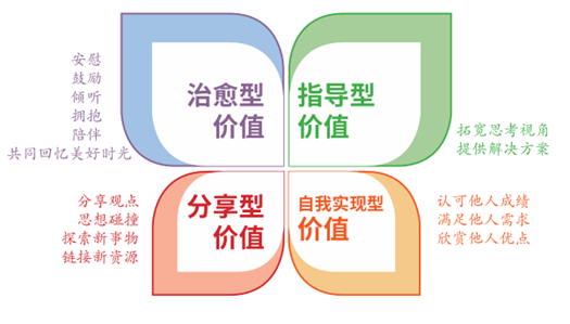 高情绪价值包括四种常见类型:治愈型价值、指导型价值、分享型价值、自我实现型价值。每种类型有其不同的表达方式,如下图:
