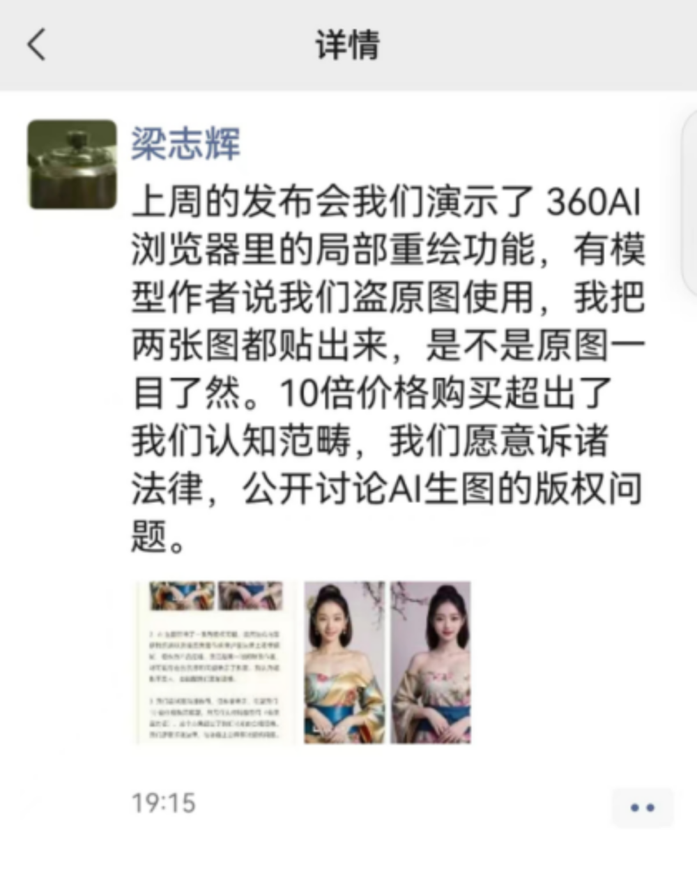 据上证报中证网,针对网络创作者DynamicWang质疑“360AI新品发布会盗图”一事后,360集团副总裁、360AI浏览器产品经理梁志辉进行了公开回应。几小时后,该创作者也晒出双方聊天记录并进行“反击”。