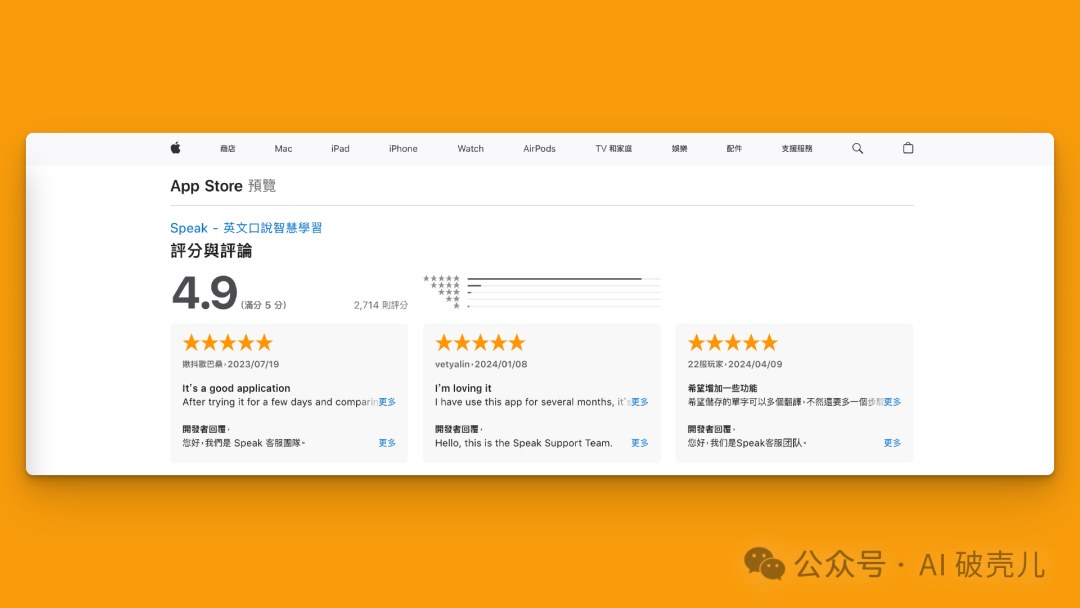 学习本身是个逆人性的生意,按理说这么高的价格,出现用户使用体验低于营销预期是很正常。但 Speak 能却让用户打出 4.8-4.9 的高分(满分 5)。