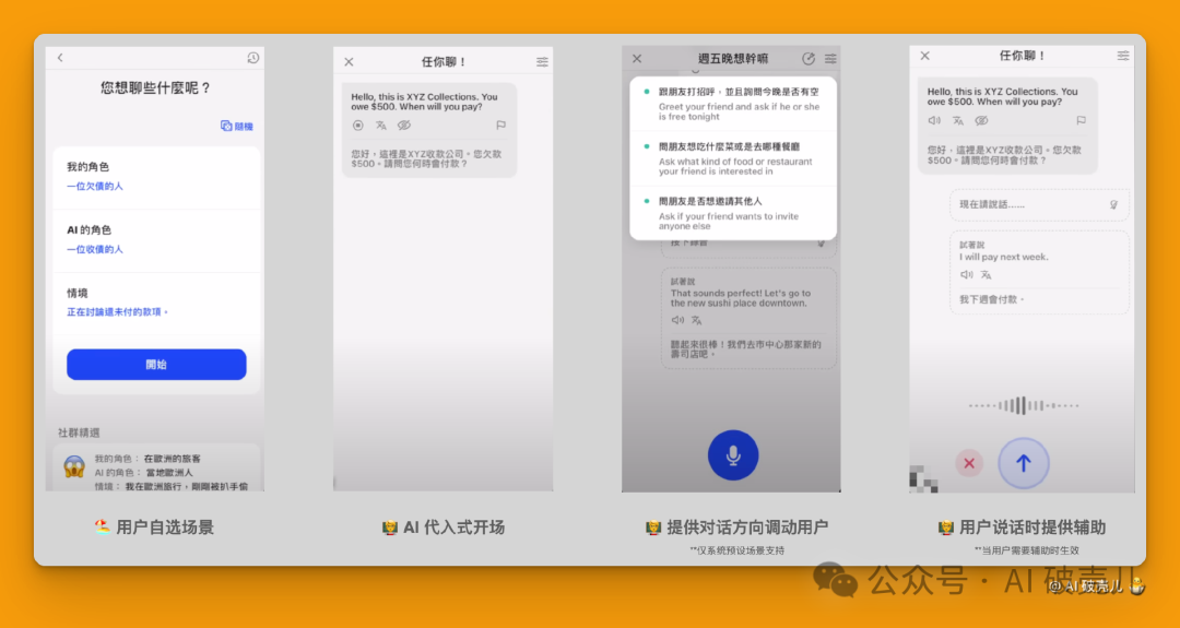 而且 AI 能根据场景内容适配对话的语气和措辞,比如上图中 AI 扮演催债人时说话就非常凶。沉浸式的对话仿佛是让用户置身于真实环境中,调动紧张感,更容易练就张口就来的胆量。