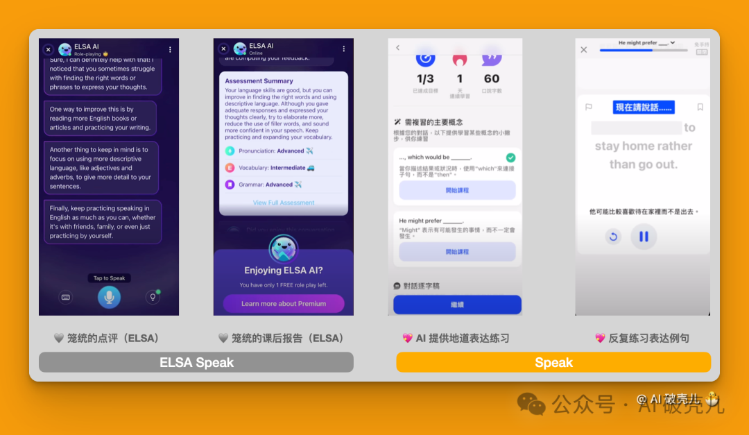而且 Speak 的教学功能也一点都不差于传统得英语学习软件,尤其是课后报告这一块,非常具体,相比之下其他的 AI 的总结水平就笼统了一些。