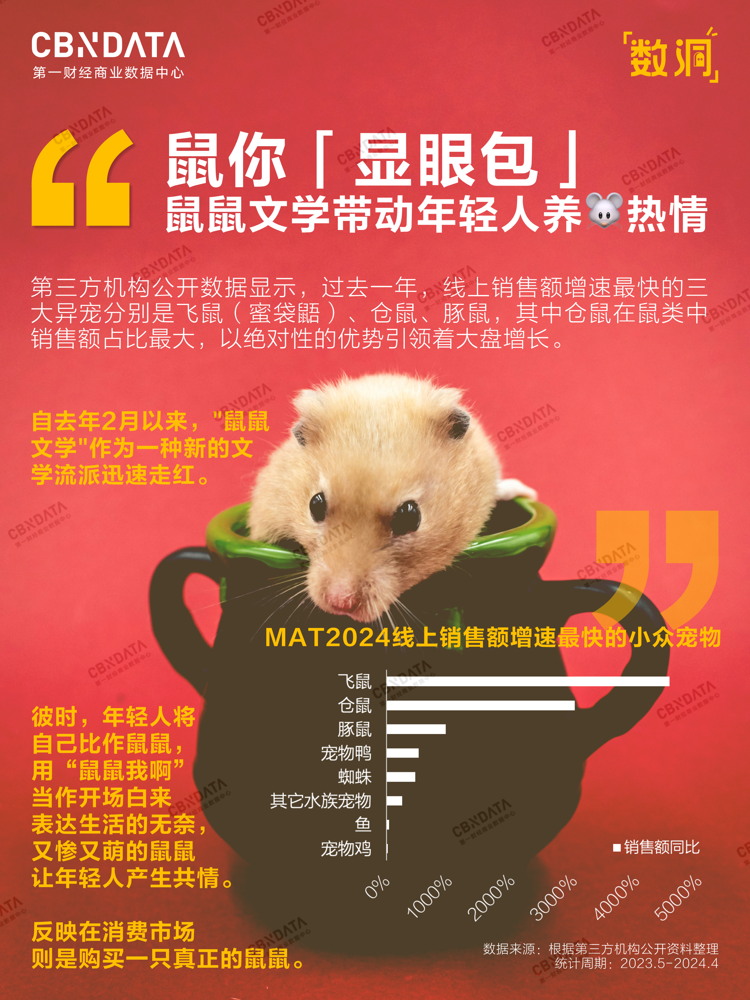 鼠类为什么能成为年轻人的“新宠”?我们通过仓鼠销售趋势的关键时间节点来进行分析。数据显示,自2023年3月起,三线、布丁、银狐等仓鼠品种的销量迅速攀升,直到10月份达到顶峰后逐渐回落,这与去年2月迅速走红的"鼠鼠文学"密切相关,与此同时,一些仓鼠博主靠着仓鼠吃播、仓鼠换装等视频涨粉无数,吸引着众多年轻人排队入坑。