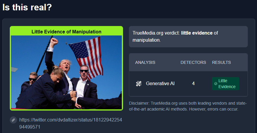 西雅图非营利组织TrueMedia.org提供的AI工具被用来评估这些图像的真实性。关键图像核实:例如,一张显示子弹在特朗普头部后面飞行的照片被TrueMedia.org的AI工具确认未被操纵。这张照片由《纽约时报》摄影师Doug Mills拍摄。