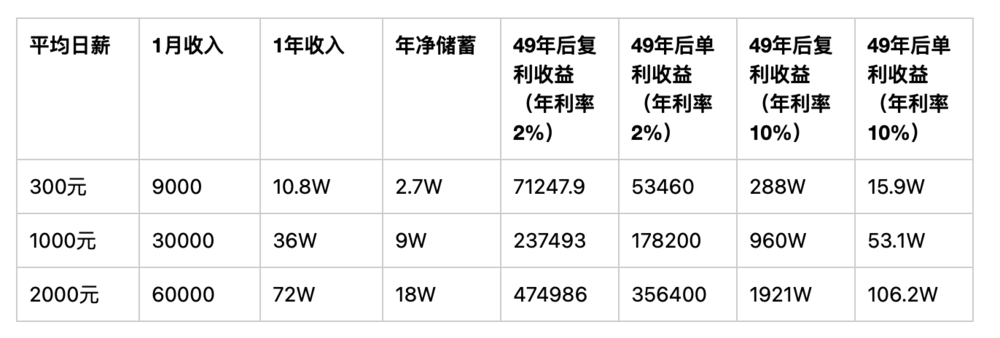 我们每个人的时间其实是有限的,除去前面20年学习,假如到60岁退休,其实也只有不到50年能真正用来财富。这里有个表格,平均日薪对应的总收入: