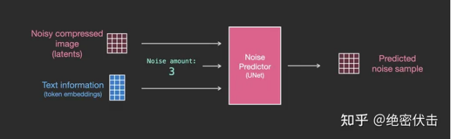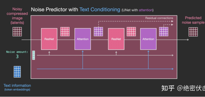 前面已经介绍了如何生成输入文字embedding,那么UNet网络又是如何使用的?实际上是在UNet的每个ResNet之间添加一个Attention,而Attention一端的输入便是文字embedding。如下图所示。