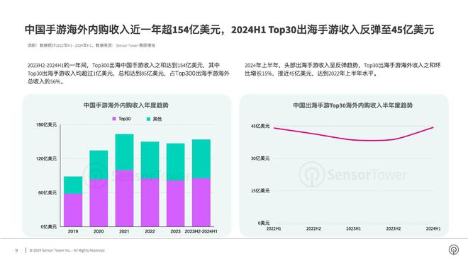 智通财经获悉,7月29日,Sensor Tower发文称,在2023年下半年至2024年上半年期间,Top300出海中国手游收入之和达到154亿美元,其中Top30出海手游收入均超过1亿美元,收入之和突破85亿美元,占Top300出海手游海外总收入的56%。上半年,头部出海手游收入增长显著,Top30出海手游海外收入之和环比增长15%,达到近45亿美元,重返2022年上半年水平。2024H1荒野求生全球吸金突破5亿美元,超过2022年与2023年收入之和。