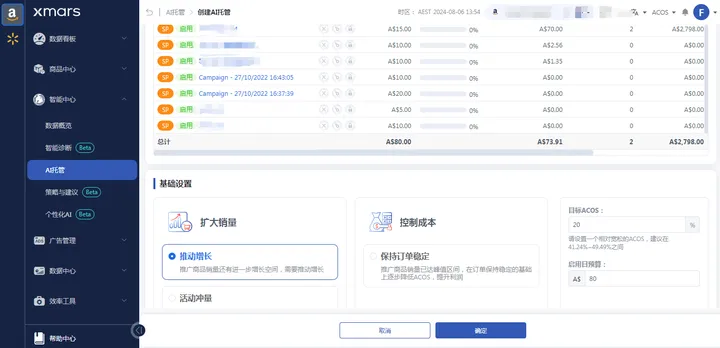 对于已创建的广告组,Xmars 也能实现AI一键托管,只需要制定好自己的ACOS目标、总体预算、广告销售目标便能一键运行,十分便捷。Xmars的AI会对每个广告活动的效果进行深度分析,每小时调整出价和预算策略,通过不断添加高潜关键词、否定表现不佳的关键词等行动,确保广告投放的精准度,大幅提升广告投放的效率及效果。
