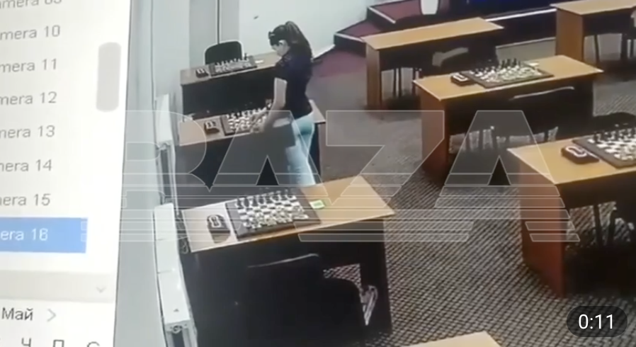 长达34秒的监控视频显示,阿巴卡罗娃在一个看起来像是摆放着用于比赛的棋盘的房间里走来走去,她似乎在其中一块棋盘上反复涂抹着什么东西,然后环顾四周走开了。