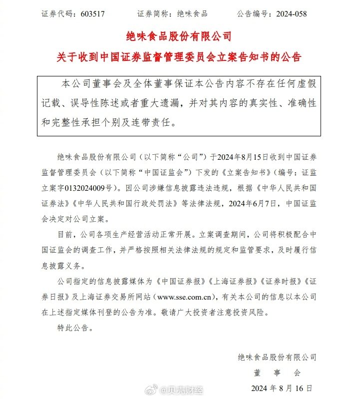 据贝壳财经,绝味食品公告,公司于2024年8月15日收到中国证监会下发的《立案告知书》,因公司涉嫌信息披露违法违规,中国证监会决定对公司立案。目前,公司各项生产经营活动正常开展,立案调查期间将积极配合调查工作,及时履行信息披露义务。