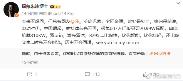 随后,极氪智能科技副总裁“朱凌博士”转发了该条微博并称:本来不想回,但总有网友艾特我。英雄迟暮,夕阳余晖,曾经是经典,终归是前浪。电动时代,中国崛起,底特律荣光不再。极氪007入门版只要20.99W标配,单电机就310KW,双orin,激光雷达,8295….比你快,比你智能,比你年轻,还比你实惠…时光不会倒流,历史不会回退,see you in my mirror。