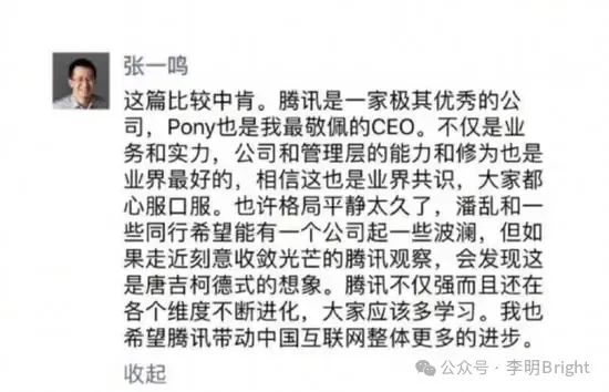 你很难不佩服,这是一家说的和做的差不多,甚至说的比做的少的公司。难怪张一鸣发朋友圈评价腾讯和Pony马化腾。