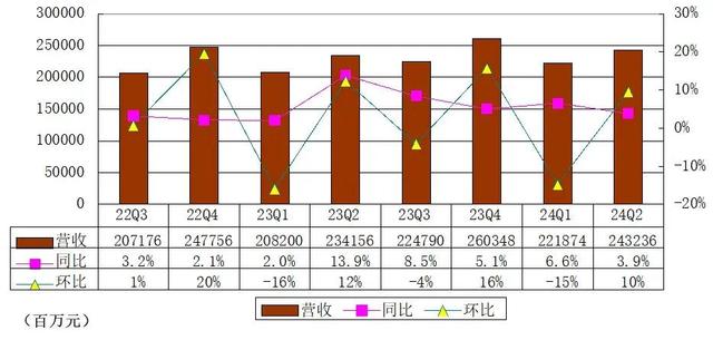 一看营收,财报显示,阿里2024年第二季度营收为2432.36亿元(334.7亿美元),同比增长4%。