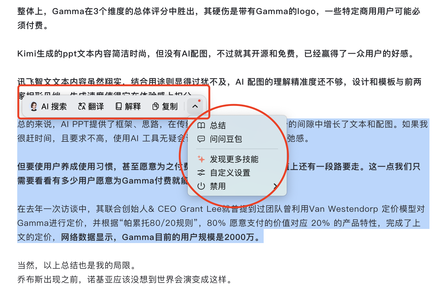 豆包的 AI 文本伴读在PC端可以跨应用服务,提供了22项模块功能,除了基础文本润色,还场景化了社畜、程序员、自媒体工作者的适用范围,它有着我想象中的基本面,但也有很大的探索和成长空间。