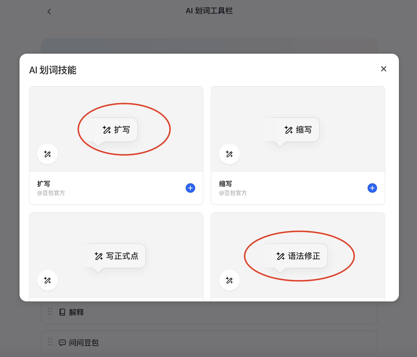 在发现更多技能中,是AI划词工具栏,下设文本的扩缩写、修正、润色等功能6项,改写为社交媒体文案或视频脚本等功能3项,生成周报、okr、代码纠错等功能4项,优缺点总结、抽取任务项、头脑风暴等6项,加之难以归类的,一共有22项模块功能可自定义置顶设置。