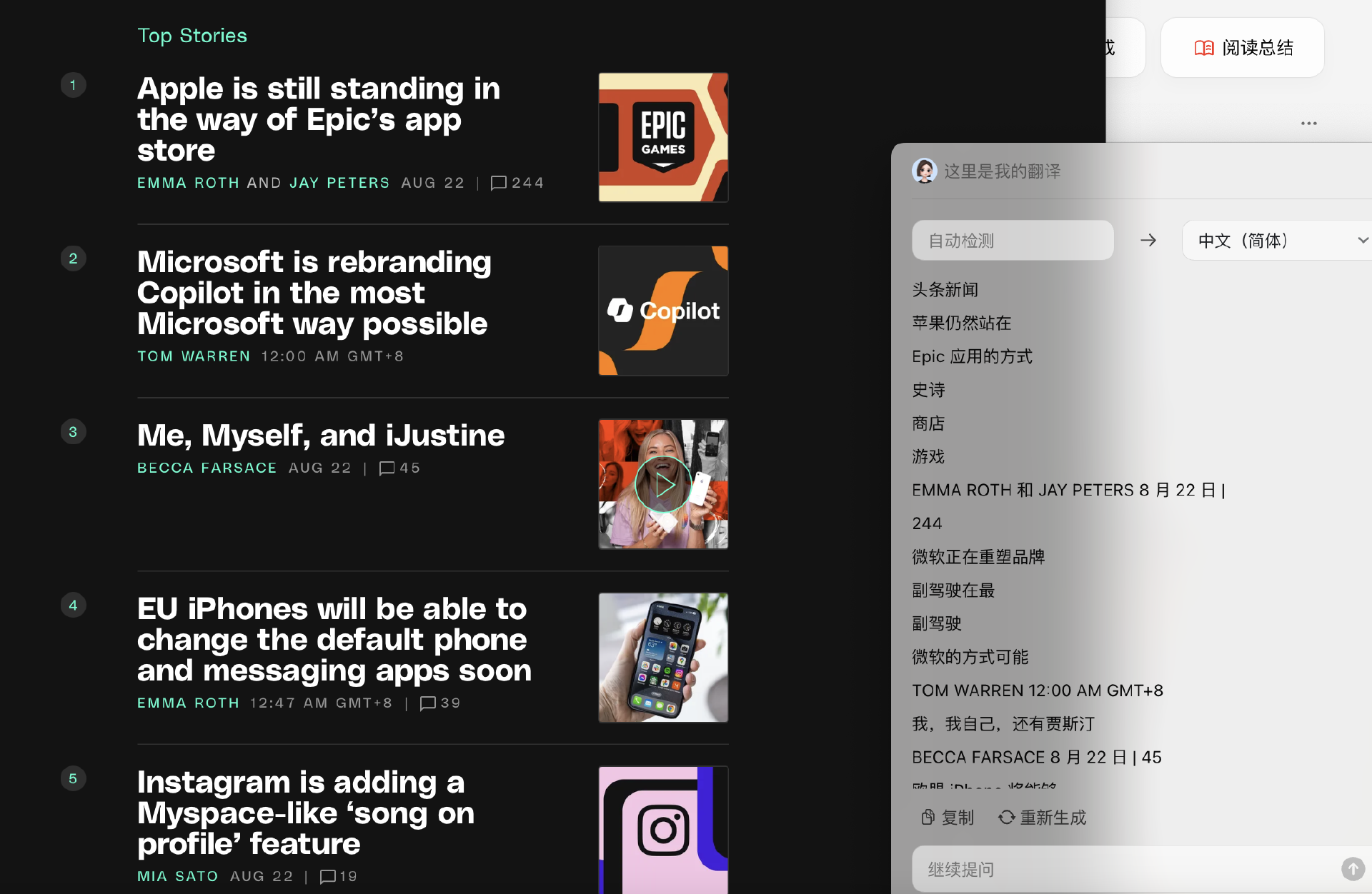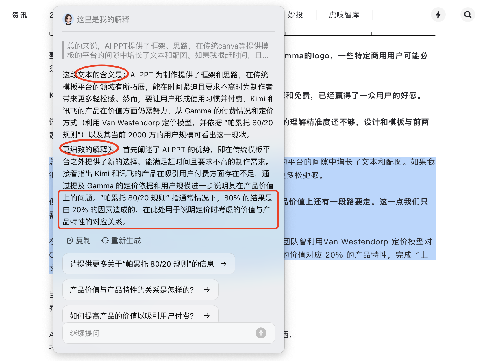 可以看出,豆包首先概括大意,接着是对话性更强的通俗阐释,亮眼的是,它主动识别并解释了所选文字段落的专有名词,如上文的“帕累托规则”。