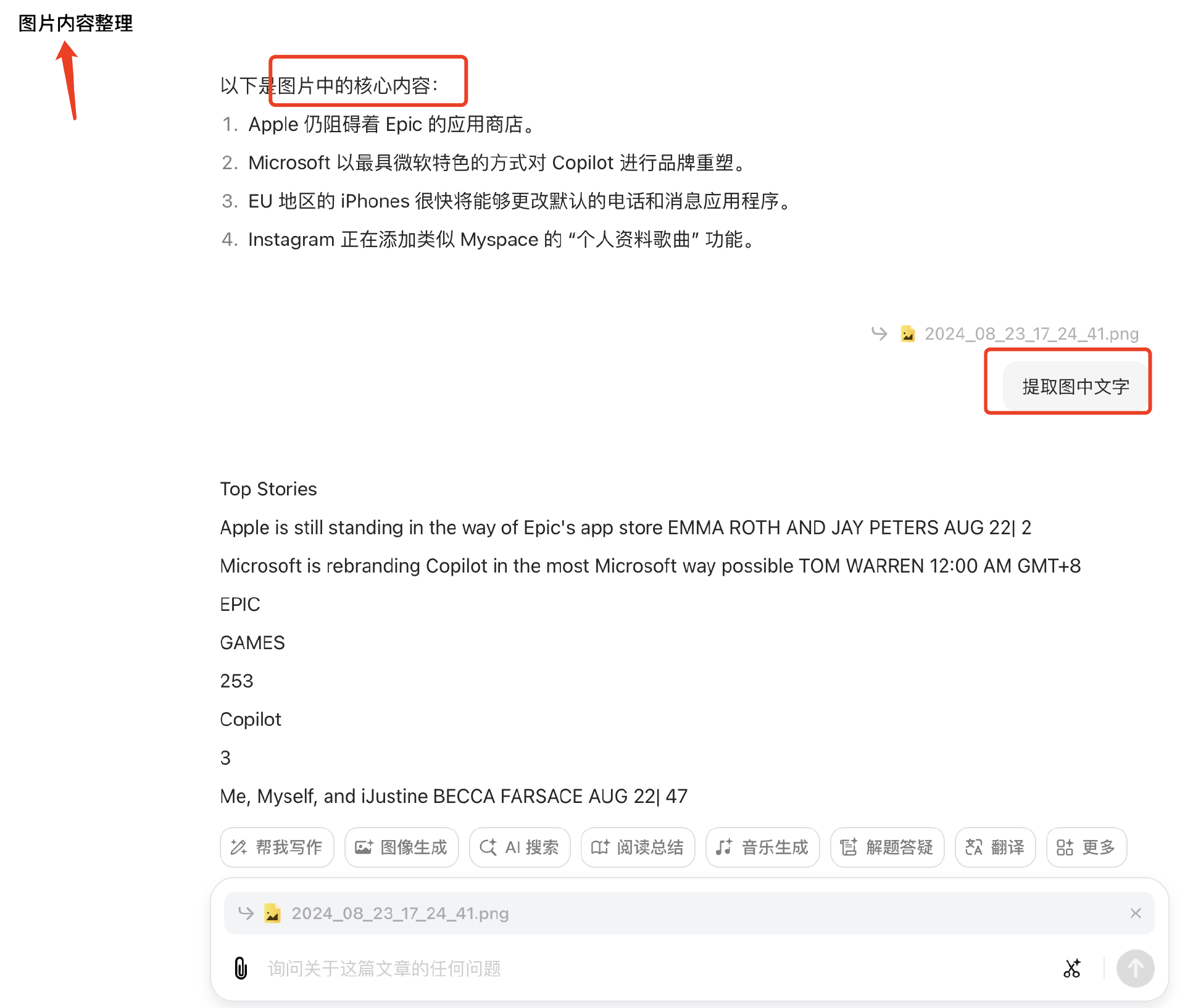 总的来说,核心内容整理功能的表现优秀,但文字提取甚至没有识别完整的图片,而这还是排列工整的铅字文。