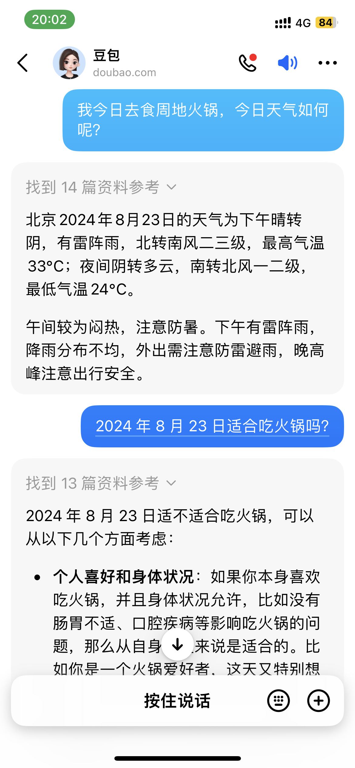 语言识别没有问题,豆包理解了“我想吃粥底火锅”,甚至提供了“北京哪里有好吃的粥底火锅?”的选择搜索项,但消息发送后跳转到了AI搜索的对话界面,且回复我的是文本而不是语音。