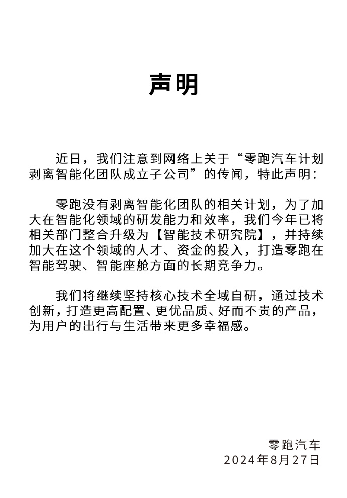 据第一财经,零跑汽车发布声明称,零跑没有剥离智能化团队的相关计划,为了加大在智能化领域的研发能力和效率,零跑今年已将相关部门整合升级为“智能技术研究院”,并持续加大在这个领域的人才、资金的投入,打造零跑在智能驾驶、智能座舱方面的长期竞争力。