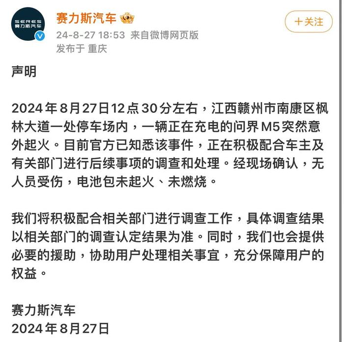 据界面新闻,针对江西赣州市问界M5充电中意外起火事件,赛力斯官方8月27日回应称,正积极配合车主及有关部门进行后续事项的调查和处理。经现场确认,无人员受伤,电池包未起火、未燃烧,具体调查结果以相关部门的调查认定为准。