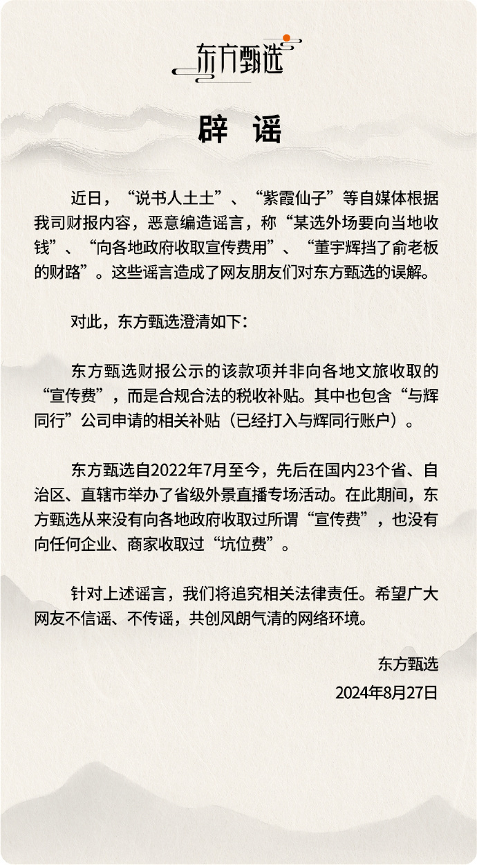 据界面新闻,8月27日晚,东方甄选发布辟谣声明称,东方甄选财报公示的该款项并非向各地文旅收取的“宣传费”,而是合规合法的税收补贴。其中也包含“与辉同行”公司申请的相关补贴(已经打入与辉同行账户)。东方甄选自2022年7月至今,先后在国内23个省、自治区、直辖市举办了省级外景直播专场活动。在此期间,东方甄选从来没有向各地政府收取过所谓“宣传费”,也没有向任何企业、商家收取过“坑位费”。