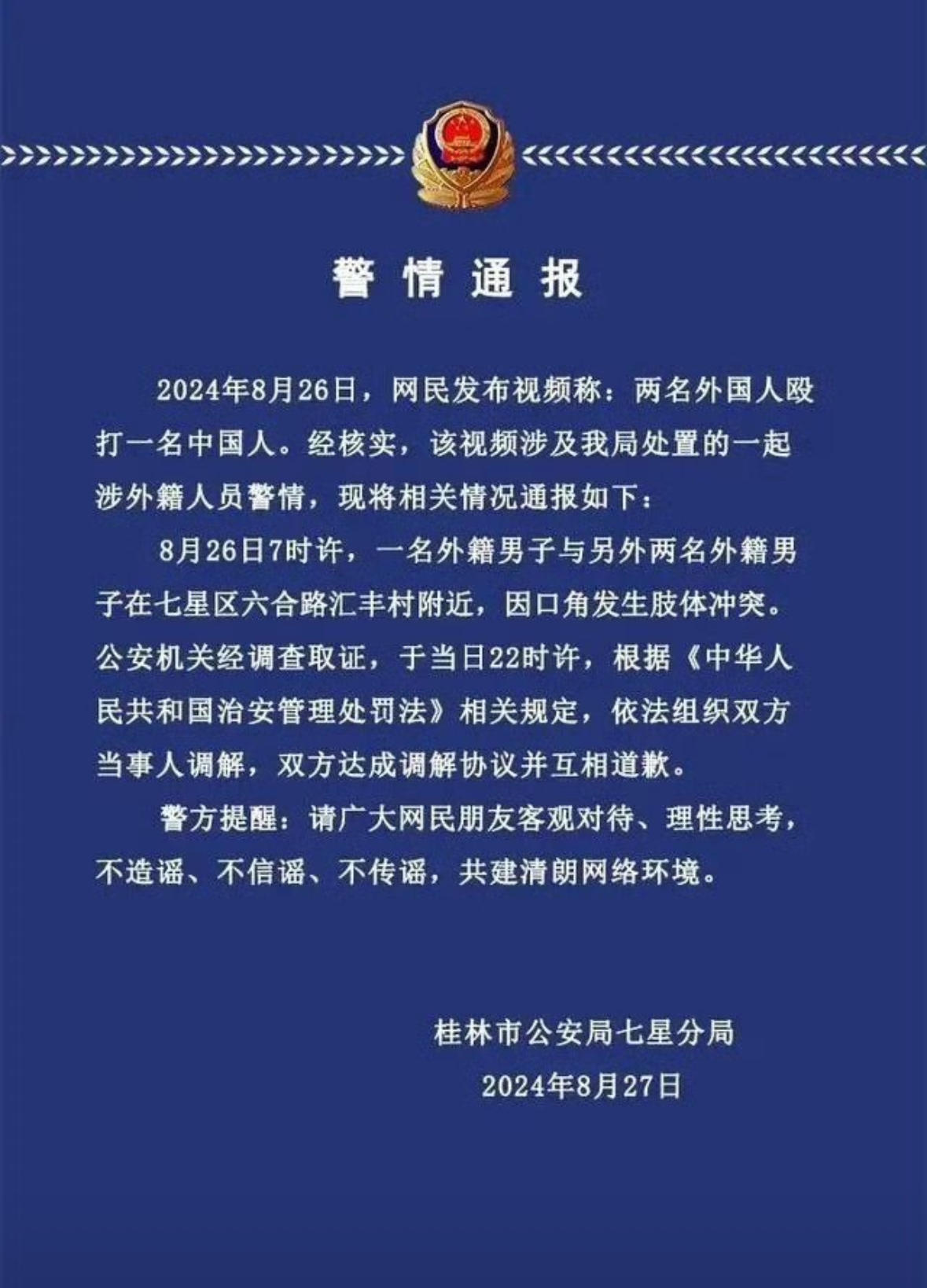 据北京头条,桂林市公安局七星分局通报:2024年8月26日,网民发布视频称:两名外国人殴打一名中国人。经核实,该视频涉及我局处置的一起涉外籍人员警情,现将相关情况通报如下: