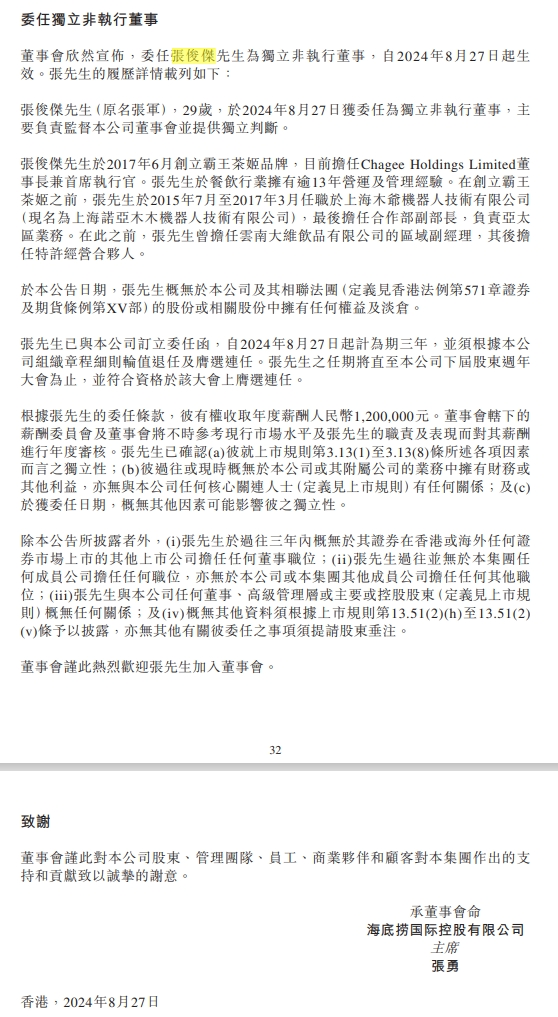 据每日经济新闻,8月27日,海底捞(HK06862,股价12.34元,市值687.3亿元)发布公告,从即日起委任29岁霸王茶姬创始人张俊杰为独立非执行董事,任期三年,年薪120万元。