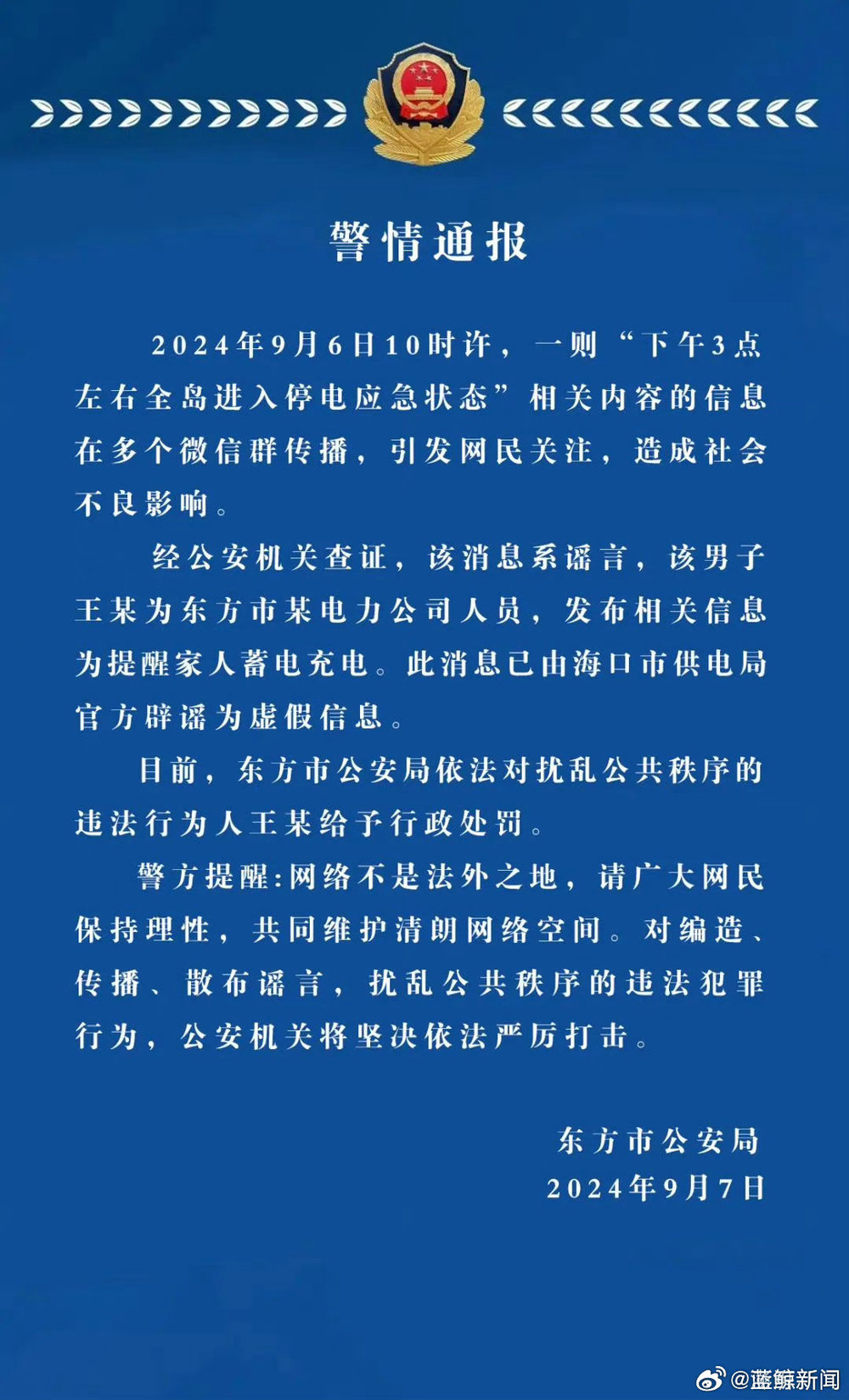 据东方市公安局9月7日通报,9月6日上午,一则“下午3点左右全岛进入停电应急状态”相关内容的信息在多个微信群传播,引发网民关注,造成社会不良影响。经公安机关查证,上述消息系谣言。 据警方通报,违法行为人王某为东方市某电力公司人员,发布相关信息为提醒家人蓄电充电。此消息已由海口市供电局辟谣为虚假信息。目前,东方市公安局已对“扰乱公共秩序”的王某给予行政处罚。