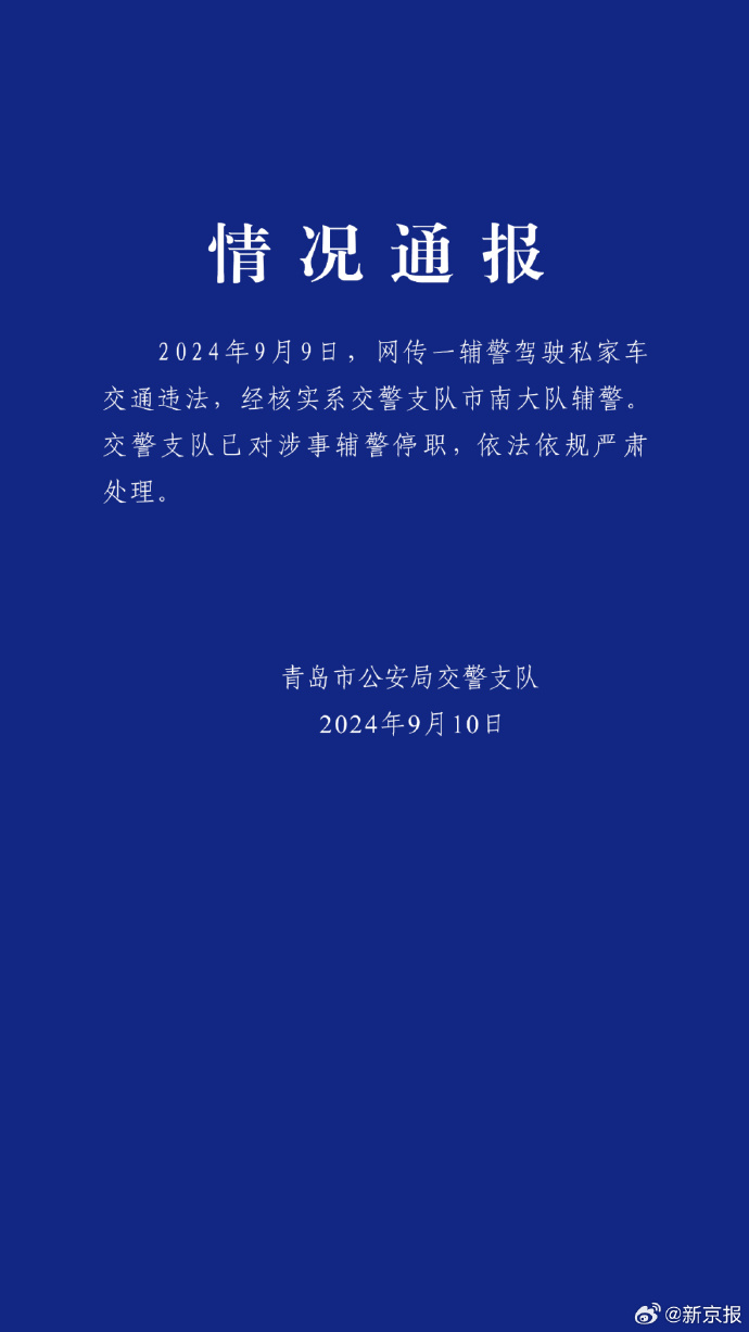 据新京报,近日,有网友发布视频称,山东青岛一辅警未系安全带开私家车逆行,引发关注。针对此事,9月10日,青岛市公安局交警支队发布情况通报:9月9日,网传一辅警驾驶私家车交通违法,经核实系交警支队市南大队辅警。交警支队已对涉事辅警停职,依法依规严肃处理。