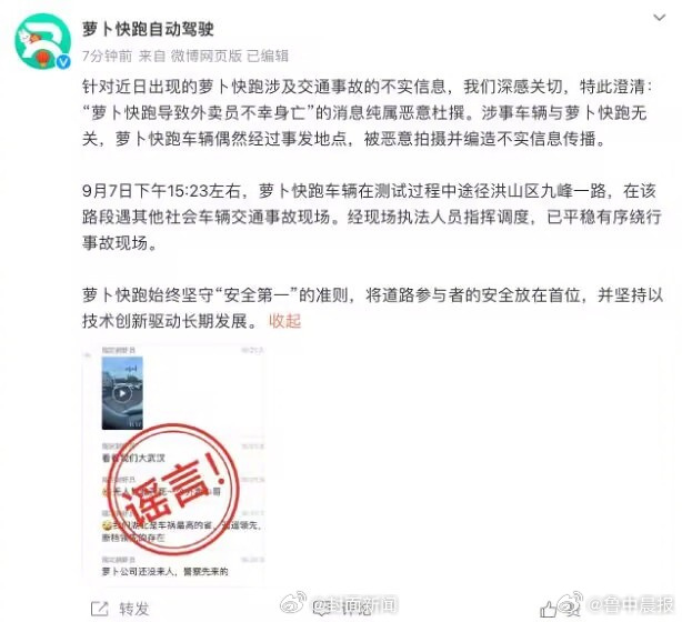 据鲁中晨报,9月10日,湖北武汉,有网友称萝卜快跑发生事故,致一名外卖小哥死亡。萝卜快跑发布官方声明表示,萝卜快跑导致外卖员不幸身亡”的消息纯属恶意杜撰。萝卜快跑车辆偶然经过事发地点,被恶意拍摄并编造不实信息传播。萝卜快跑表示,将始终坚守“安全第一”的准则,把道路参与者的安全放在首位,并坚持以技术创新驱动长期发展。