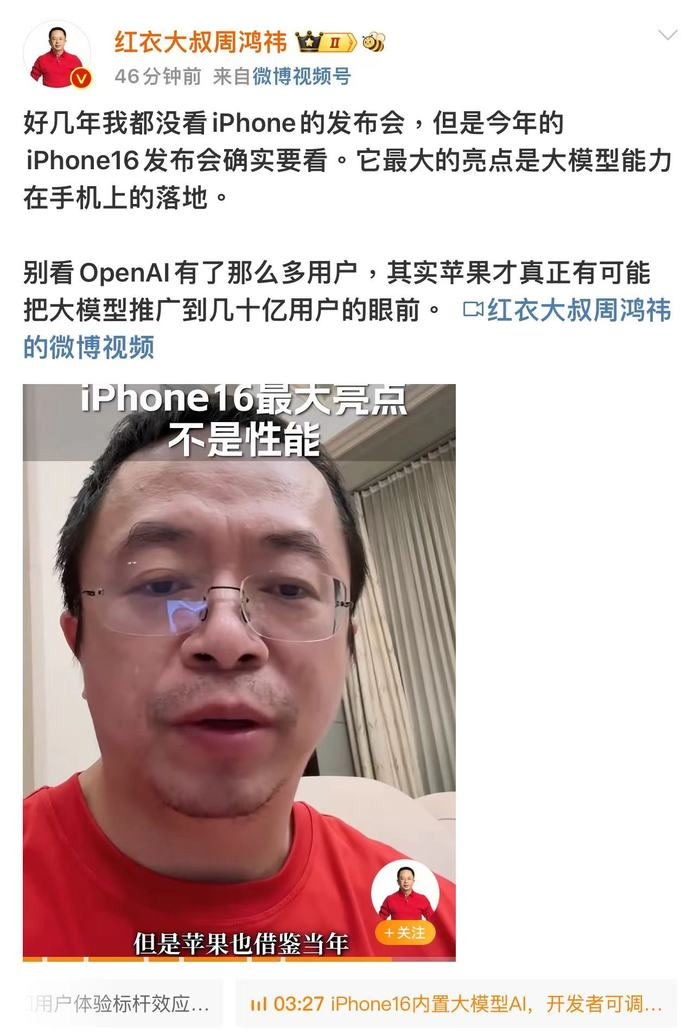 据界面新闻,360集团创始人、董事长周鸿祎9月10日在微博发布视频称,好几年都没看iPhone的发布会,但是今年的iPhone16发布会确实要看。它最大的亮点是大模型能力在手机上的落地。 别看OpenAI有了那么多用户,其实苹果才真正有可能把大模型推广到几十亿用户的眼前。