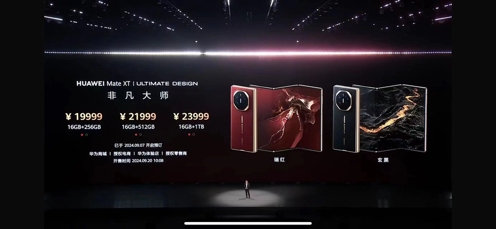 据财联社,今日,华为三折叠屏手机Mate XT非凡大师正式发布,售价19999元起,将于9月20日10:08正式开售。
