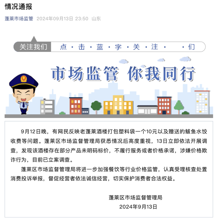 据界面新闻,山东烟台蓬莱区市场监督管理局通报,9月12日晚,有网民反映老蓬莱酒楼打包塑料袋一个10元以及赠送的鲅鱼水饺收费等问题。蓬莱区市场监督管理局获悉情况后高度重视,13日立即依法开展调查,发现该酒楼存在部分产品未明码标价,不履行服务或者价格承诺,涉嫌价格欺诈行为,目前已立案调查。