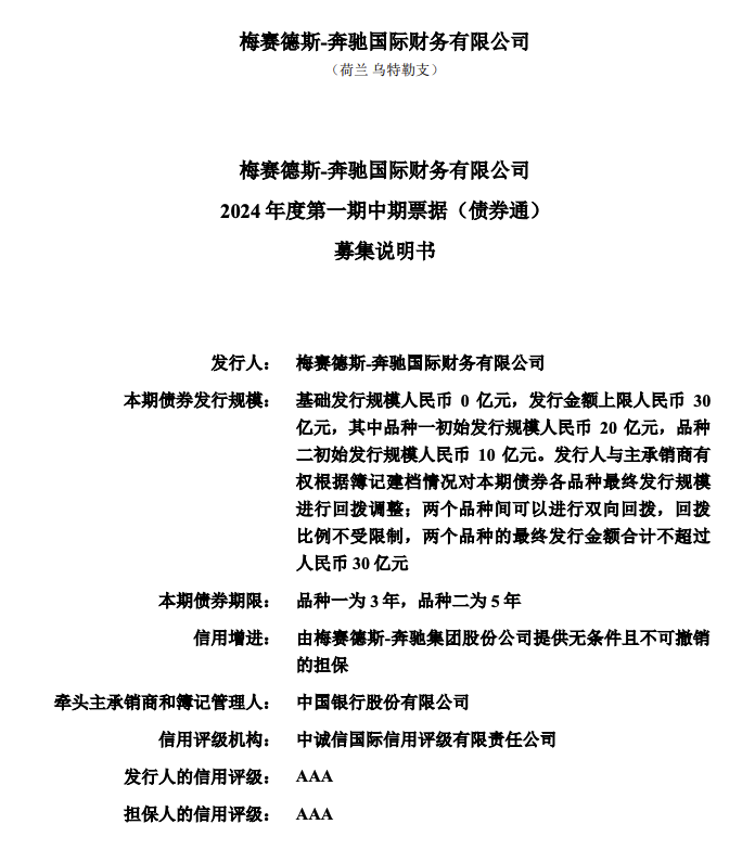 据界面新闻,9月19日,梅赛德斯-奔驰国际财务有限公司在中国货币网公告,将于9月23日在中国银行间债市簿记发行2024年度第一期中期票据,金额合计不超过30亿元人民币。本期债券由梅赛德斯-奔驰集团股份公司提供无条件且不可撤销的担保,其中3年期品种初始发行规模20亿元,5年期品种初始发行规模10亿元。募集资金净额将全部划付出境用于一般公司用途。