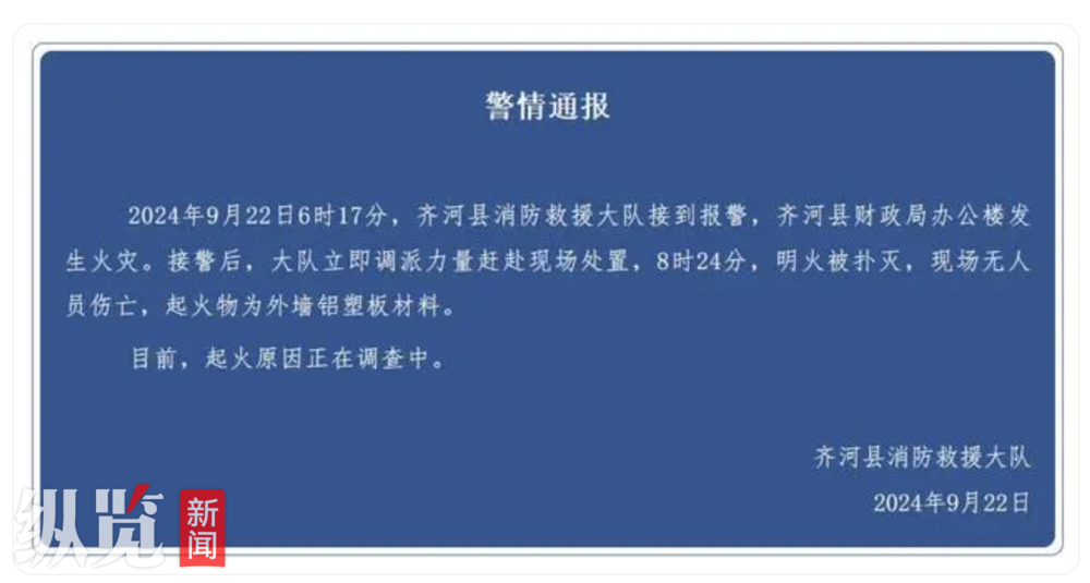 据纵览新闻,山东德州齐河县消防救援大队通报,9月22日6时17分,齐河县消防救援大队接到报警,齐河县财政局办公楼发生火灾。接警后,大队立即调派力量赶赴现场处置,8时24分,明火被扑灭,现场无人员伤亡,起火物为外墙铝塑板材料。目前,起火原因正在调查中。