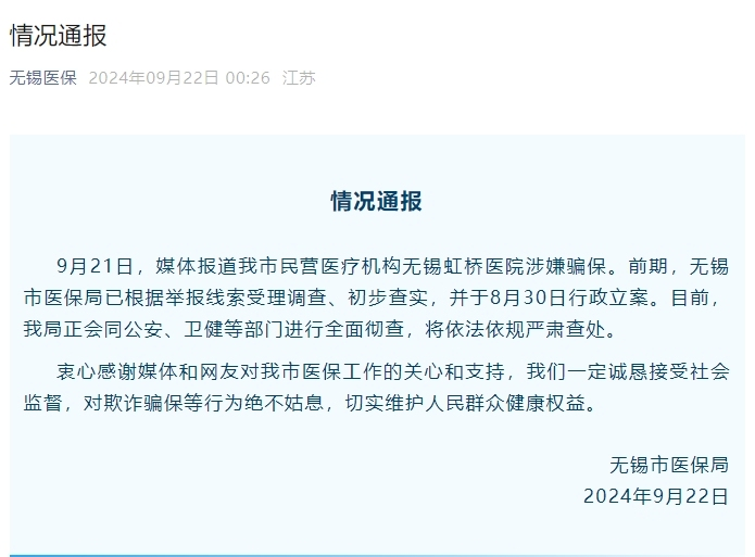 对此,无锡市医保局今日凌晨发布公告回应,已根据举报线索受理调查、初步查实,并于8月30日行政立案;目前正会同公安、卫健等部门进行全面彻查,将依法依规严肃查处。