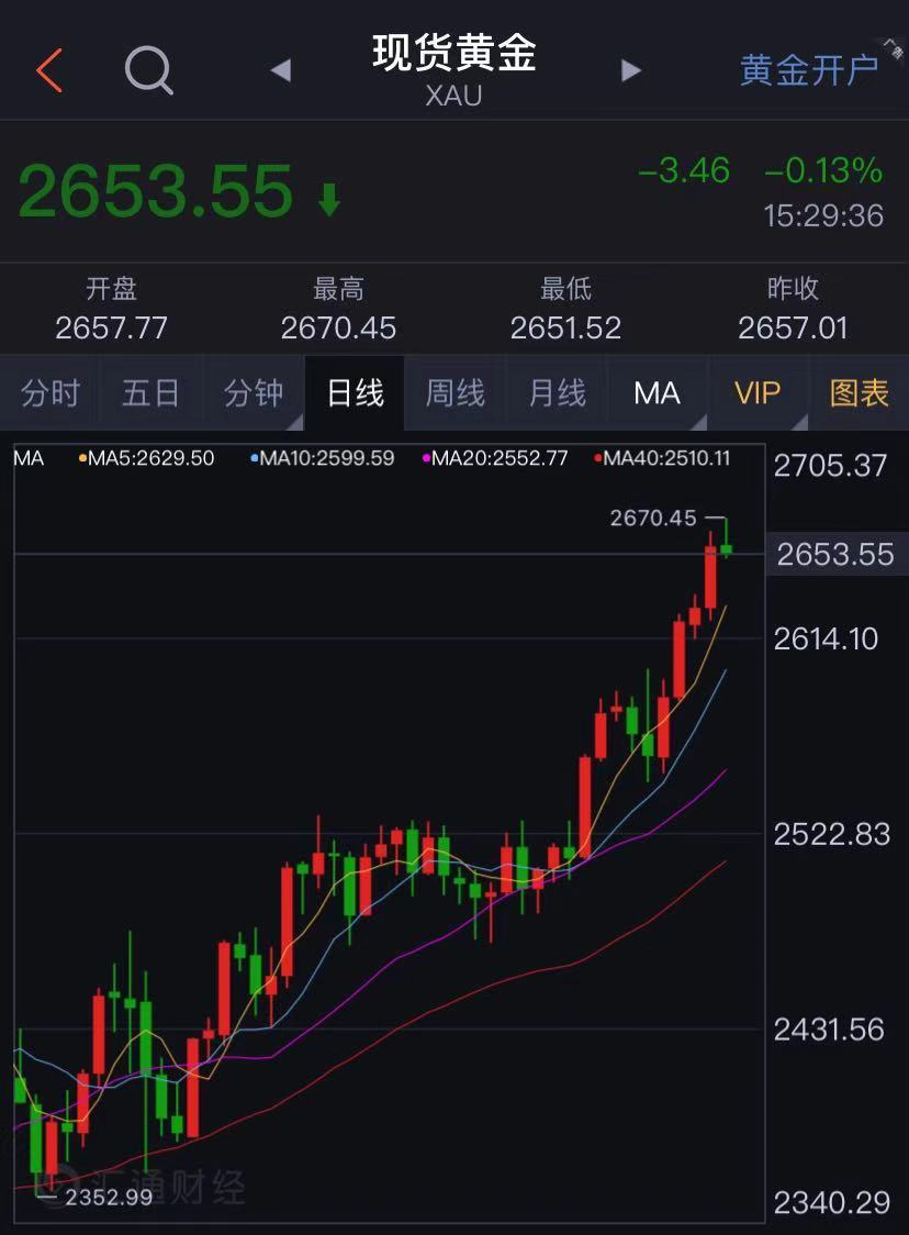 据每日经济新闻,9月25日,现货黄金盘中升破每盎司2665美元,再创纪录新高,今年累涨29%。截至发稿,现货黄金价格报2653.55美元/盎司。
