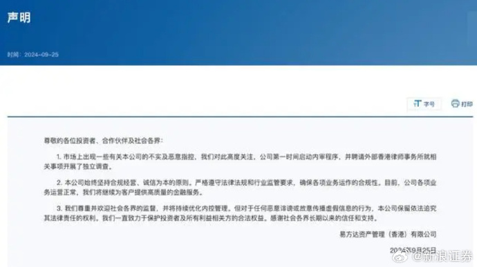 对此,易方达基金对此进行回应:1. 市场上出现一些有关本公司的不实及恶意指控,我们对此高度关注,公司第一时间启动内审程序,并聘请外部香港律师事务所就相关事项开展了独立调查。2. 本公司始终坚持合规经营、诚信为本的原则。严格遵守法律法规和行业监管要求,确保各项业务运作的合规性。目前,公司各项业务运营正常,我们将继续为客户提供高质量的金融服务。3. 我们尊重并欢迎社会各界的监督,并将持续优化内控管理。但对于任何恶意诽谤或故意传播虚假信息的行为,本公司保留依法追究其法律责任的权利。我们一直致力于保护投资者及所有利益相关方的合法权益。感谢社会各界长期以来的信任和支持。