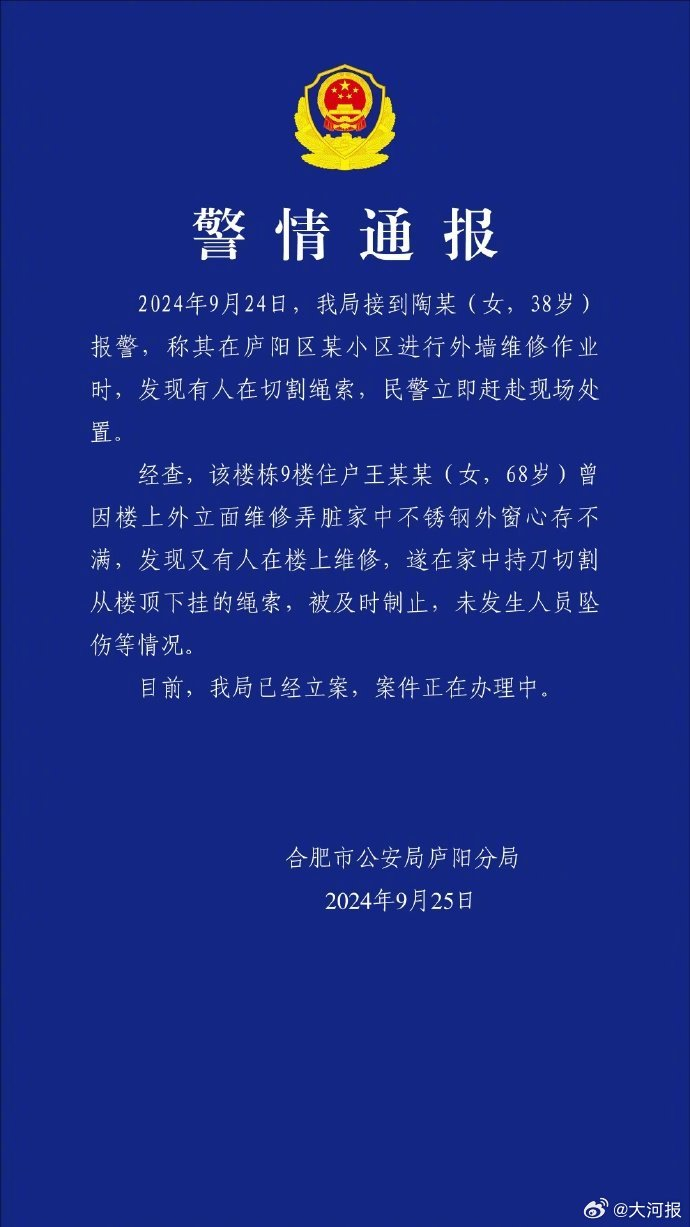 据大河报 ,9月25日,安徽合肥警方发布通报:2024年9月24日,我局接到陶某(女,38岁)报警,称其在庐阳区某小区进行外墙维修作业时,发现有人在切割绳索,民警立即赶赴现场处置。经查,该楼栋9楼住户王某某(女,68岁)曾因楼上外立面维修弄脏家中不锈钢外窗心存不满,发现又有人在楼上维修,遂在家中持刀切割从楼顶下挂的绳索,被及时制止,未发生人员坠伤等情况。目前,我局已经立案,案件正在办理中。