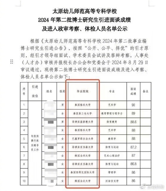 据中国新闻周刊,近日,太原幼儿师范高等专科学校发布的事业编博士研究生引进录取情况引发热议。根据公示内容,拟引进的10名人才中,全部来自海外,大多为毕业于东南亚及东亚国家的博士研究生,如泰国格乐大学、泰国易三仓大学、菲律宾亚当森大学、菲律宾基督教大学、韩国全州大学以及韩国全北大学等,所学专业有汉语言文学、管理学、体育与运动、教育学、艺术学等。并提供20万元以内安家费,10万元以内科研启动费。网友质疑,上述编制岗是否存在因人设岗、“萝卜招聘”,或校内非编人员通过留学“镀金”获得人才引进待遇,“东南亚水博卷土重来了吗?”