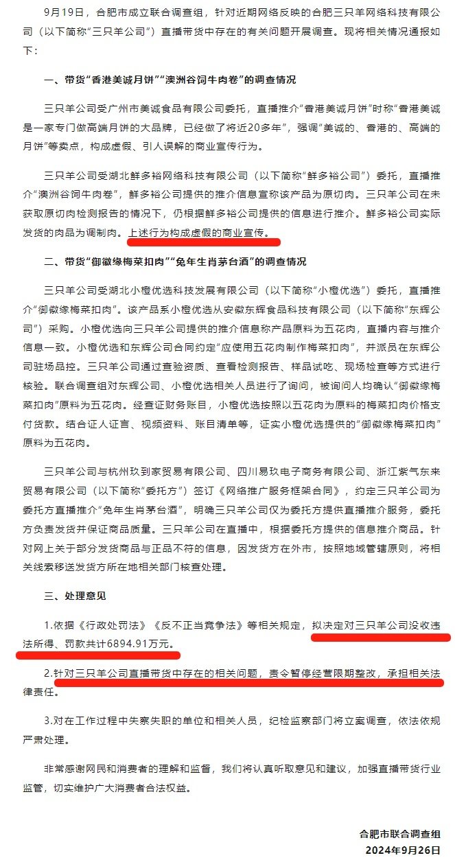 据财联社,合肥市联合调查组9月26日通报,9月19日,合肥市成立联合调查组,针对近期网络反映的合肥三只羊网络科技有限公司(以下简称“三只羊公司”)直播带货中存在的有关问题开展调查。依据《行政处罚法》《反不正当竞争法》等相关规定,拟决定对三只羊公司没收违法所得、罚款共计6894.91万元。针对三只羊公司直播带货中存在的相关问题,责令暂停经营限期整改,承担相关法律责任。对在工作过程中失察失职的单位和相关人员,纪检监察部门将立案调查,依法依规严肃处理。
