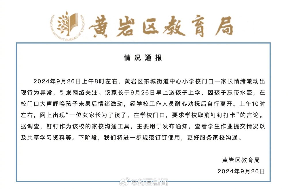 据封面新闻,9月26日,浙江台州黄岩区教育局发布通报:当日上午8时左右,黄岩区东城街道中心小学校门口一家长情绪激动出现行为异常,引发网络关注。该家长于9月26日早上送孩子上学,因孩子忘带水壶,在校门口大声呼唤孩子未果后情绪激动,经学校工作人员耐心劝抚后自行离开。上午10时左右,网上出现“一位女家长为了孩子,在学校门口,要求学校取消钉钉打卡”的言论。下阶段,教育局将进一步规范钉钉使用,更好服务家校沟通。