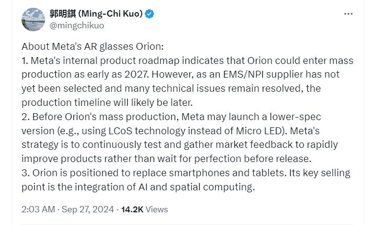郭明錤表示,Meta内部的产品路线显示,Orion最快在2027年量产。但目前尚未决定哪家公司负责生产和将产品从设计推向量产,再加上还面临一些技术上的挑战,因此实际量产时间可能会比预期更晚。