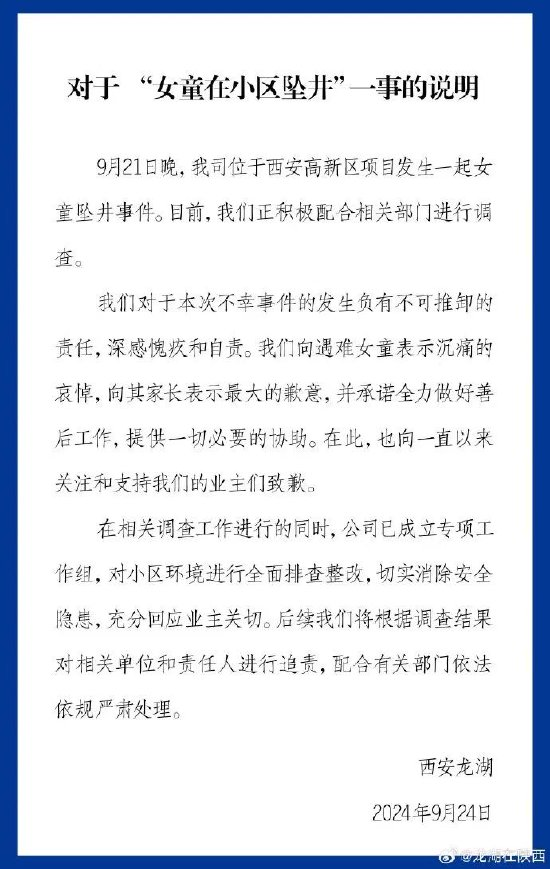 据新浪财经,9月26日晚间消息,西安龙湖发布“女童在小区坠井”一事说明。龙湖方面提到,目前正积极配合相关部门进行调查。在相关调查工作进行的同时,公司已成立专项工作组,对小区环境进行全面排查整改,切实消除安全隐患,充分回应业主关切。后续我们将根据调查结果对相关单位和责任人进行追责,配合有关部门依法依规严肃处理。